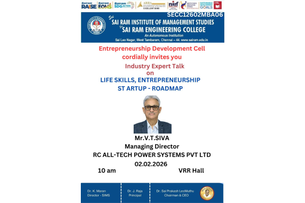 SIMS and ED cell organized Seminar on life skills Entrepreneurship start up Mr.V.T.Siva Managing Director RC ALL TECH Power Systems Pvt Ltd.